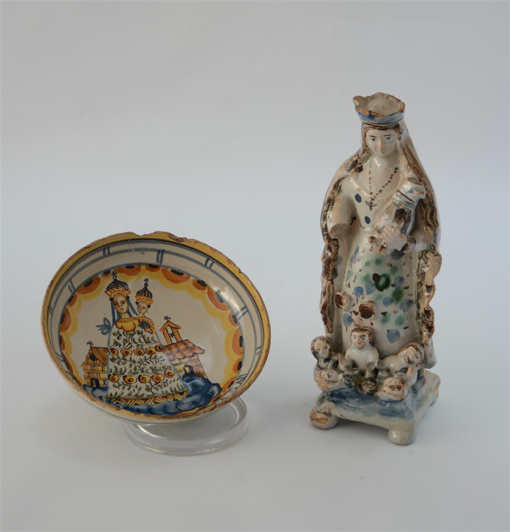 Manifattura dell'Italia meridionale, lotto composto da una coppetta dipinta raffigurante la Madonna col Bambino recante l'iscrizione ''Con pol di s casa'' (con polvere di santa casa), e una scultura raffigurante la Madonna del mare. Fine secolo XVIII, inizio XIX (d cm 12,5 e h cm 18) (difetti e mancanze)