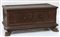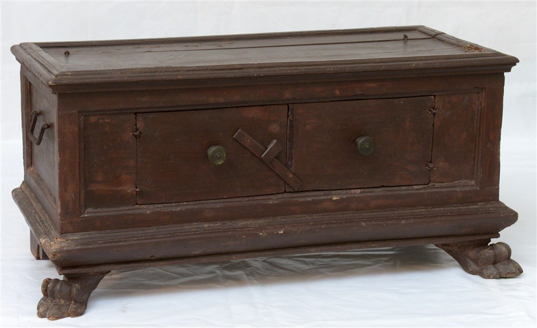 Antica cassapanca con due sportelli sul fronte e piedi anteriori a zampa ferina