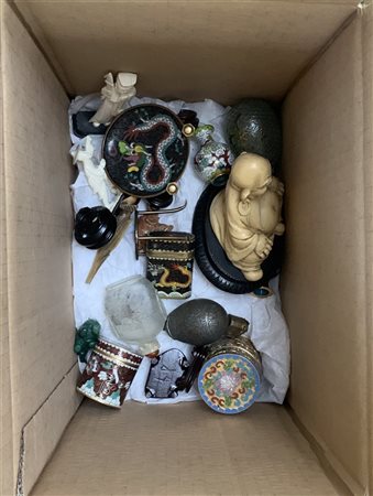 Scatola contenente numerosi oggetti di manifattura orientale, materiali diversi