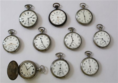 Lotto composto da dieci orologi da tasca in argento e metallo, di diverse dimensioni, epoche e fatture