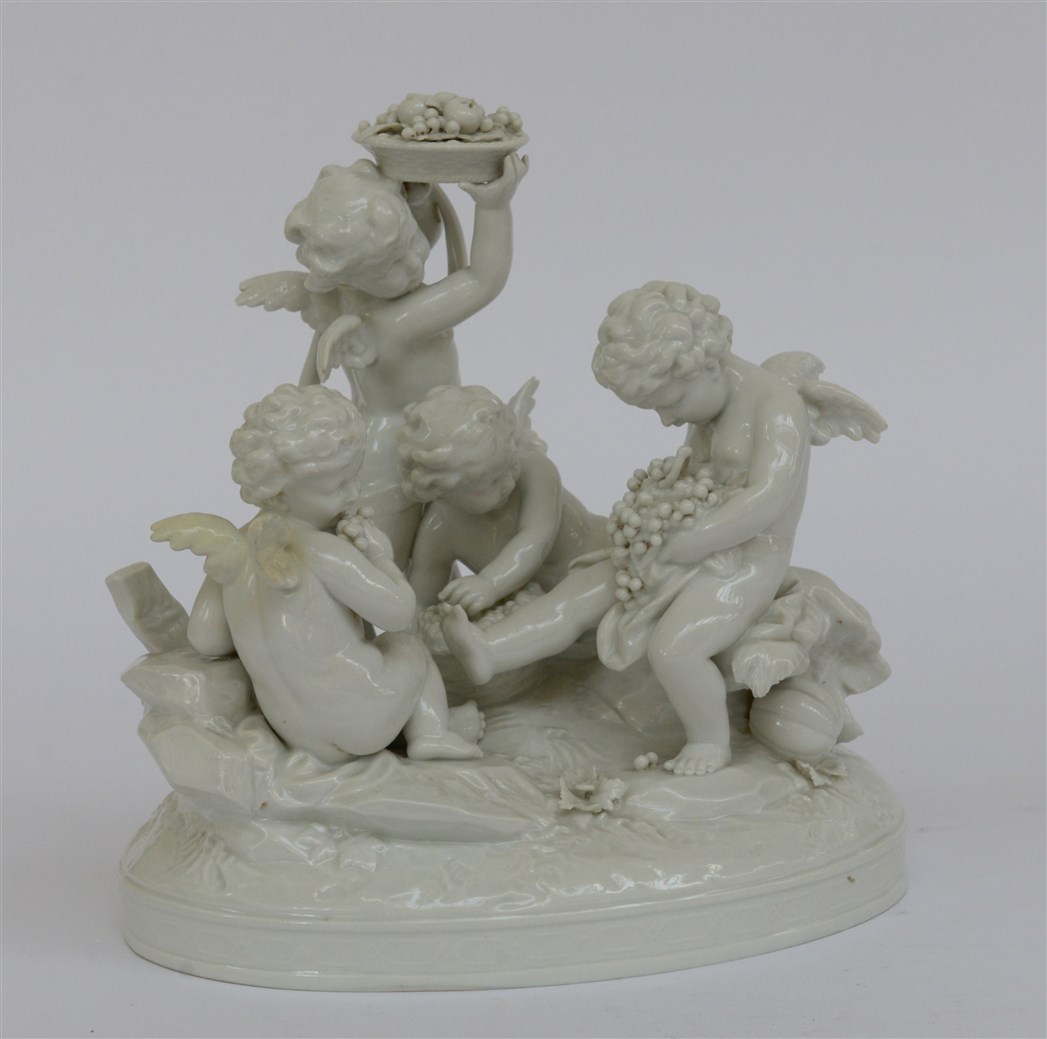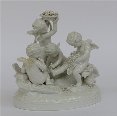 Manifattura del secolo XX. Gruppo in porcellana bianca raffigurante putti alati