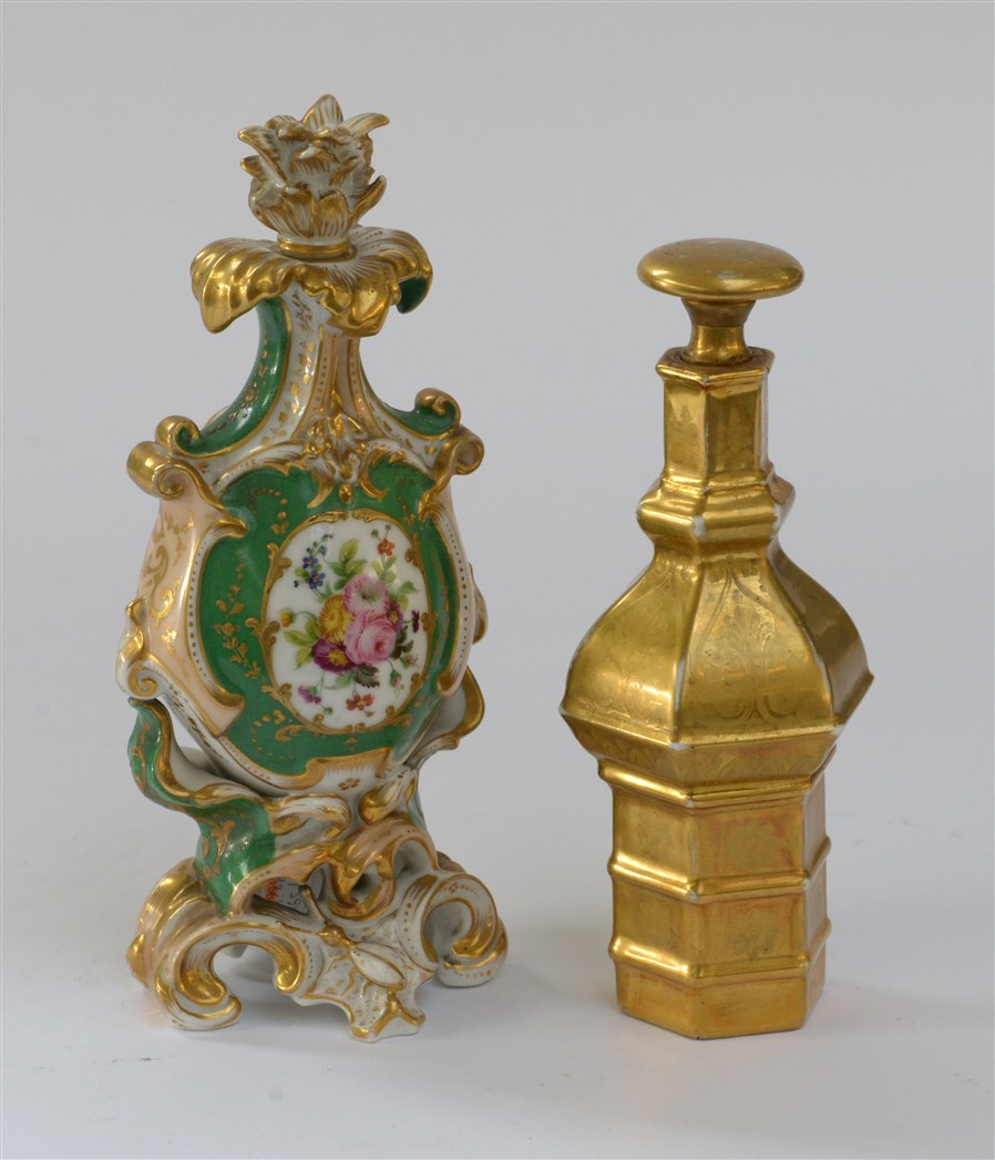 Manifattura francese, secolo XIX. Lotto composto da due bottiglie in porcellana a fondo dorato e policromia a fiori (h. max cm 24) (difetti)