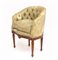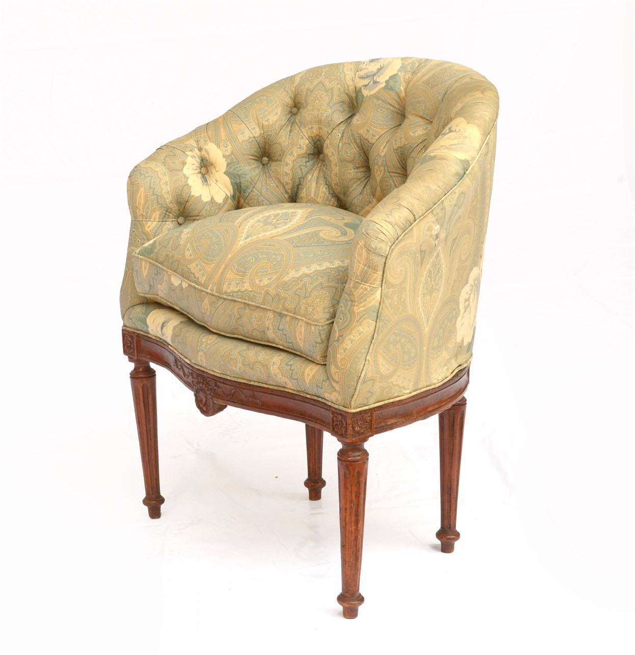 Poltroncina a pozzetto con fascia intagliata a nastro e profilo femminile, gambe tornite e scanalate, rivestita in tessuto a disegno cachemire. Secolo XVIII (difetti)