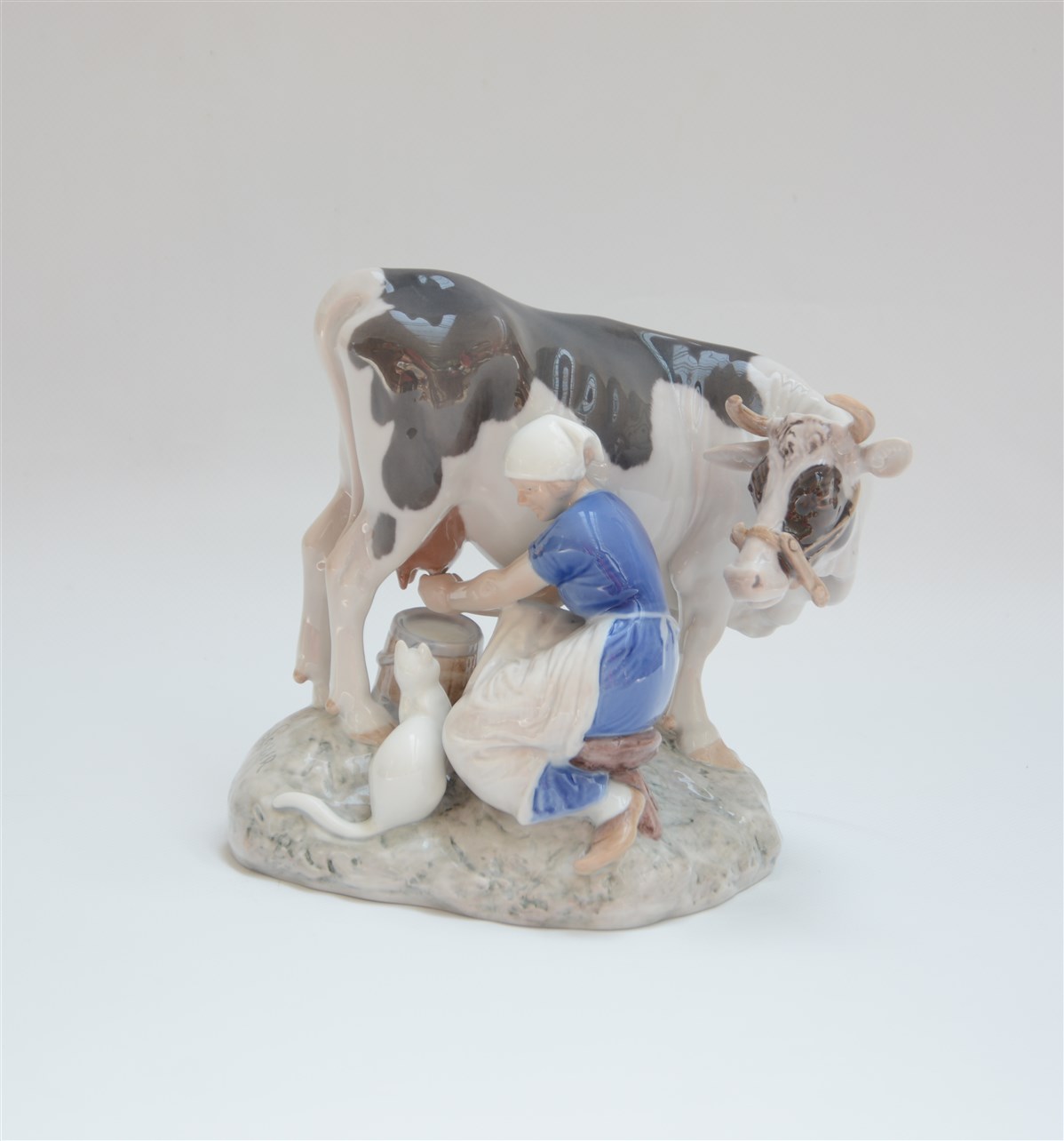 Manifattura danese Bing & Grondahl, scultura in porcellana raffigurante la mungitura, firmata alla base Axel Locher (h cm 19) (lievi difetti)