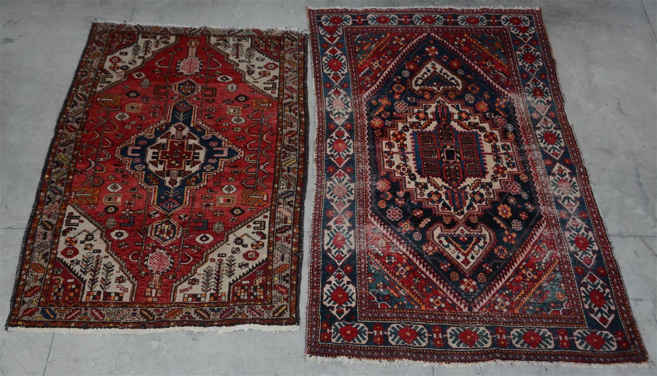 Lotto composto da due tappeti persiani annodati a mano in lana decorati con medaglioni e simboli floreali stilizzati in policromia (cm 238x149
