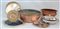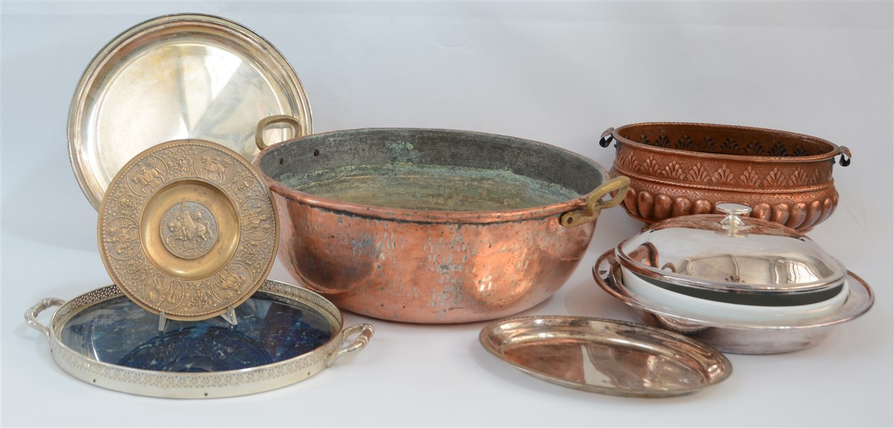 Lotto composto da una casseruola, una fioriera, un piatto decorato con cavalieri in rilievo, tre vassoi diversi ed una legumiera in rame e metallo (difetti)