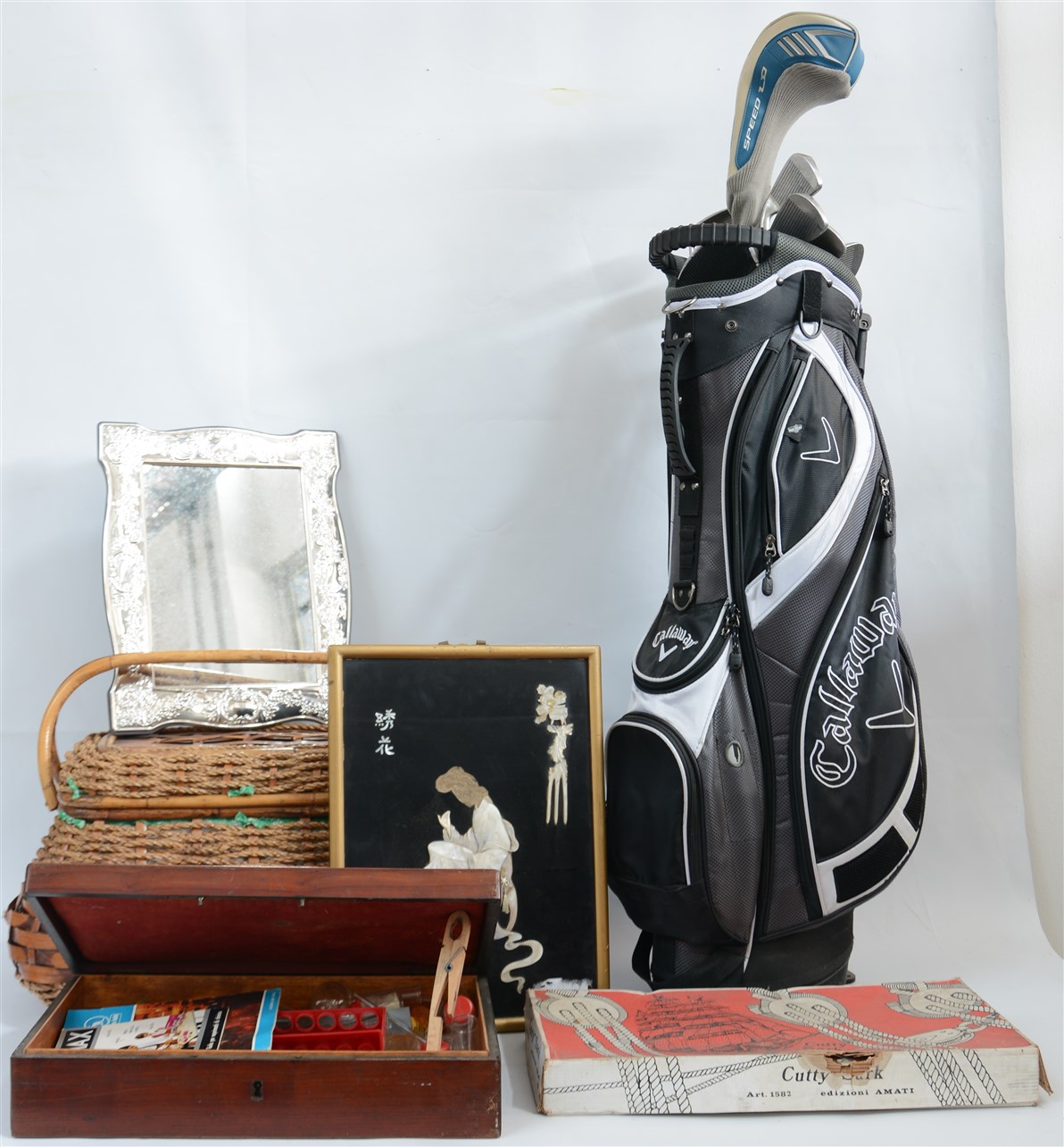 Lotto composto da una cornice in metallo argentato, un pannello orientale, una sacca da golf con alcune mazze, una scatola con modellino del cutty sark, una scatola con elementi del piccolo chimico ed un cestino da pic-nic (difetti e mancanze)