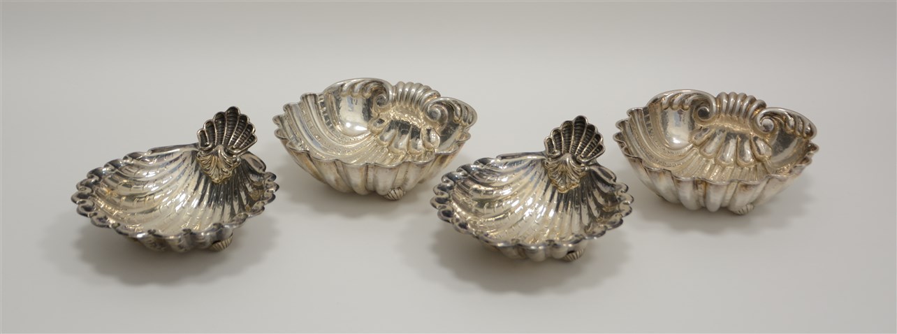 Lotto composto da quattro ciotole in argento a forma di valva di conchiglia. Ti