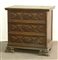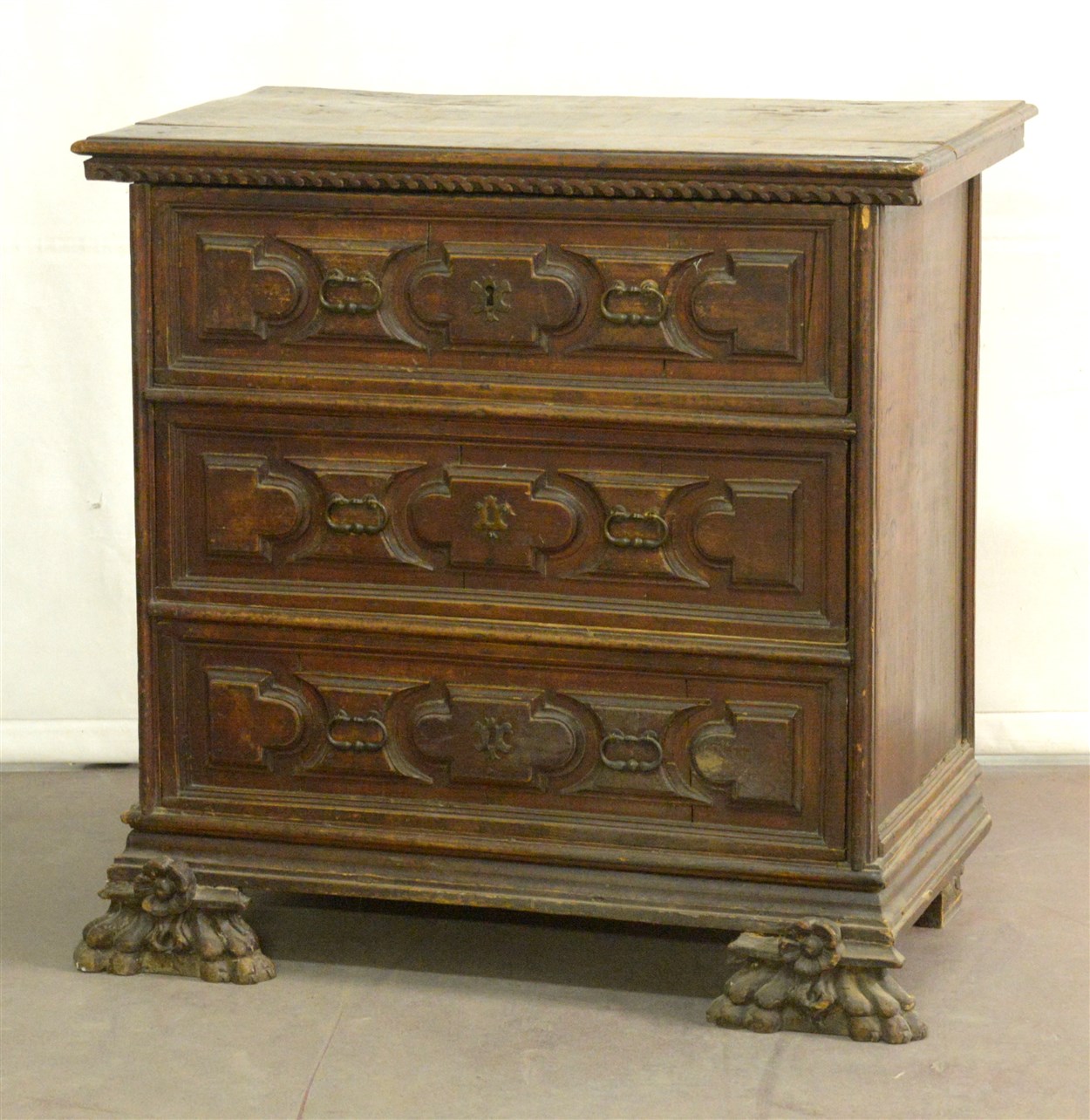 Antico comoncino a tre casetti riguadrati e pannellati, piedi anteriori intagli