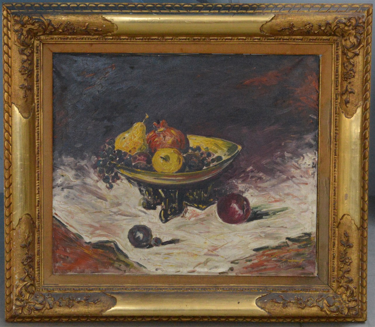 Firma indecifrata, "Natura morta con frutta", olio su tela (cm 50x60) firmato in basso a destra, in cornice (lievi difetti)