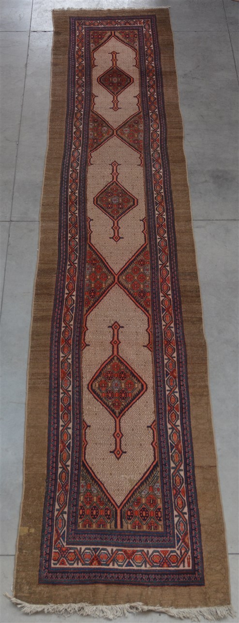 Decorato con tre medaglioni con puntali su campo beige con motivo a griglia tono su tono (cm 483x100) (difetti, sbavature e macchie)