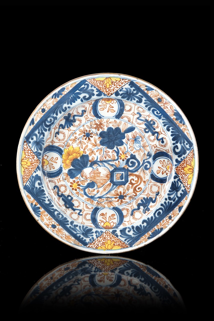 Manifattura di Felice Clerici, Milano, 1750/60 circa. Piatto tondo in maiolica a bordo tondo profilato in bruno con tesa leggermente obliqua. Decorazione, a tutta superficie, di ispirazione cinese a motivi geometrici, peonie, riserve con fiori e motivi ad occhio di pernice in rosso, blu e giallo (d. cm 21,5) (restauri)Per confronto si veda: 'Maioliche di Lodi, Milano e Pavia', catalogo della mostra, n. 221, a cura di G. Gregorietti, Museo Poldi Pezzoli, Milano 1964