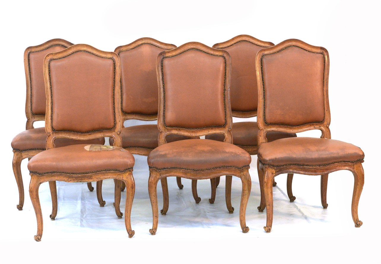 Gruppo di sei antiche sedie in noce con gambe sagomate, schienale e seduta in pelle (difetti)