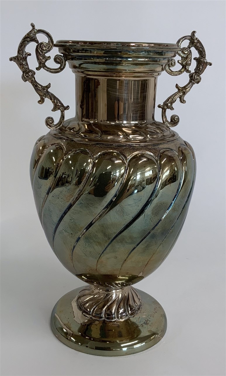 Vaso biansato in argento, anse a doppie volute fogliate. Argeniteri F.lli Cacchione (g. 730 ca.)
