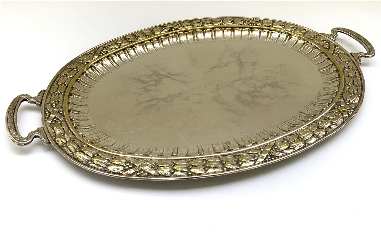 Vassoio biansato in metallo argentato di forma ovale con bordure decorate a mot