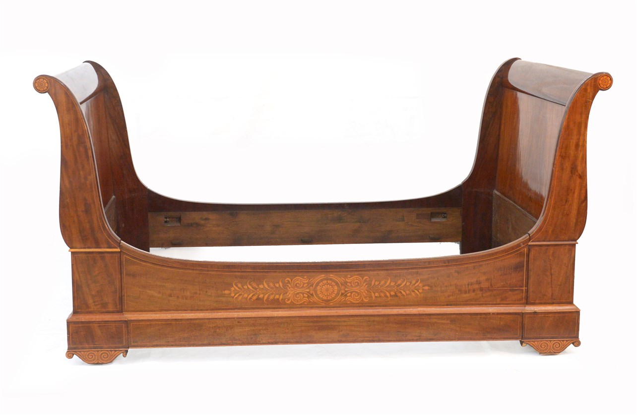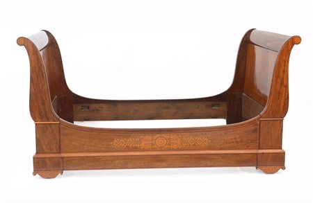 Letto a barca lastronato, radicato e filettato, fascia intarsiata con rosone e motivi vegetali, saec. XIX (difetti)