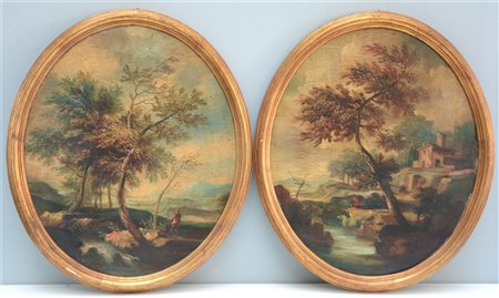 Ignoto "Paesaggi" coppia di dipinti ad olio su tela ovale (cm 59x49 ciascuno) i