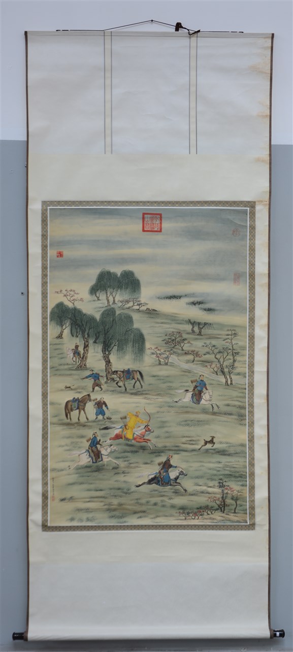 Arte cinese. Scroll verticale dipinto a tempera su seta raffigurante una scena di caccia, iscritto e firmato (cm 130x81)(difetti)