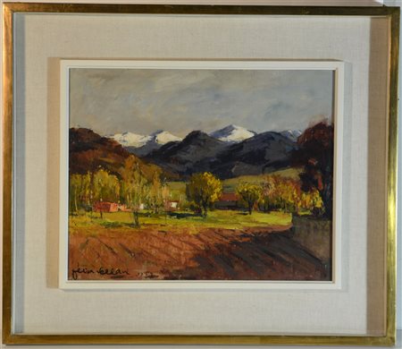 "Presso Mondovì, verso Frabosa" olio su cartone (cm 40x50) Firmato e datato 1959 in basso a sinistra. Al retro: titolato e datato 1960. In cornice