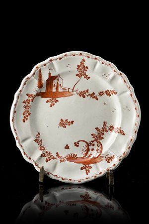 Manifattura di Pasquale Rubati, Milano 1780 circa. Piatto polilobato in maiolica decorato in monocromia rossa 'al casotto rosso' con edificio rurale su zolla erbosa contrapposto ad una riserva barocca con graticcio (d. cm 20) (usure allo smalto)Sul retro è presente il numero 5 in bruno. Per confronti si vedano le schede a cura di R. Ausenda in Musei e Gallerie di Milano - Museo d'Arti Applicate Ceramiche, Tomo II, Electa 2001.