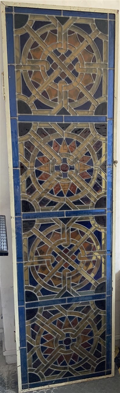 Due ante di finestra con vetrata policroma montata a piombo a decoro geometrico