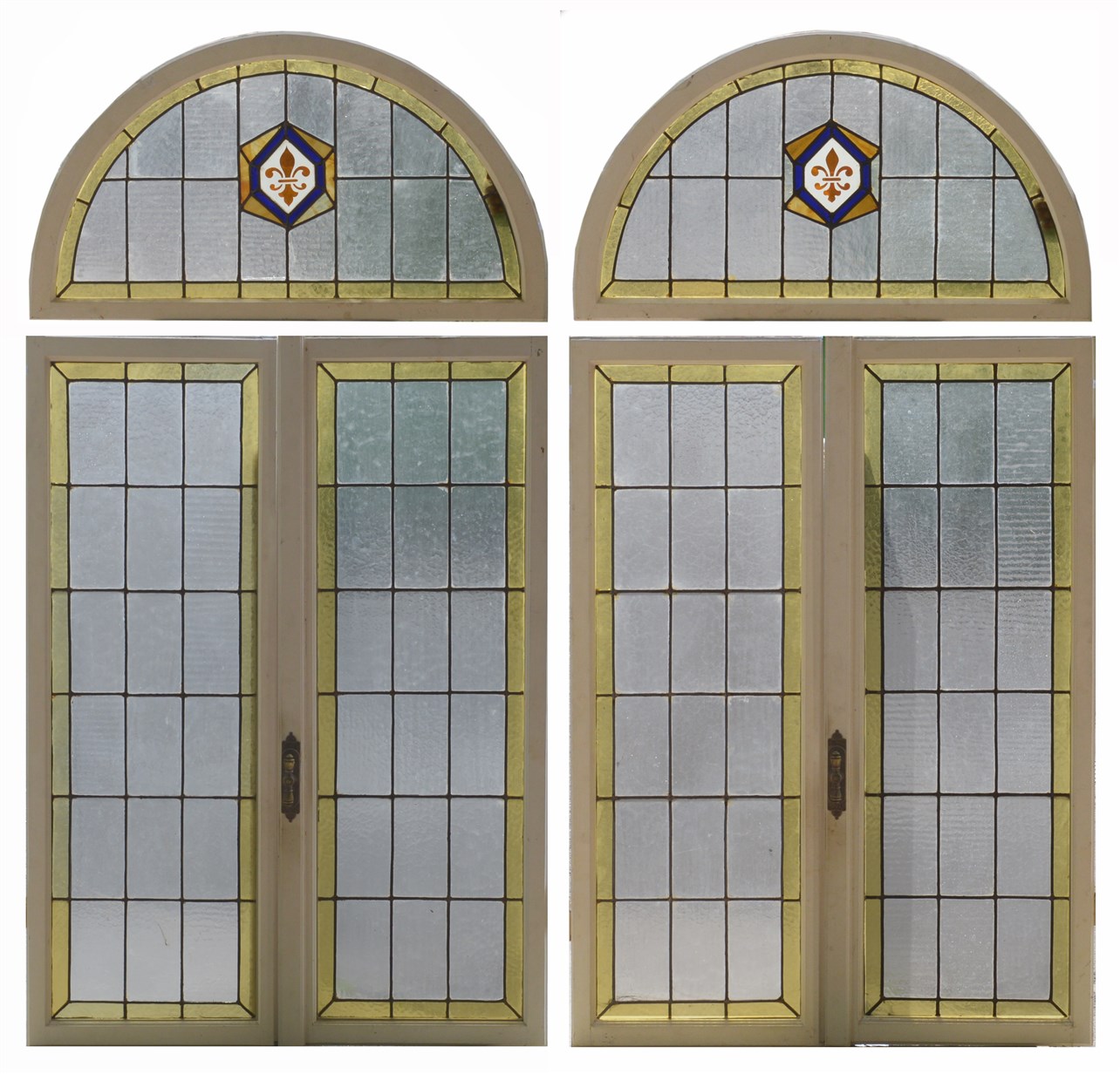 Coppia di finestre a doppio battente con lunette con vetrate a vetri dipinti in