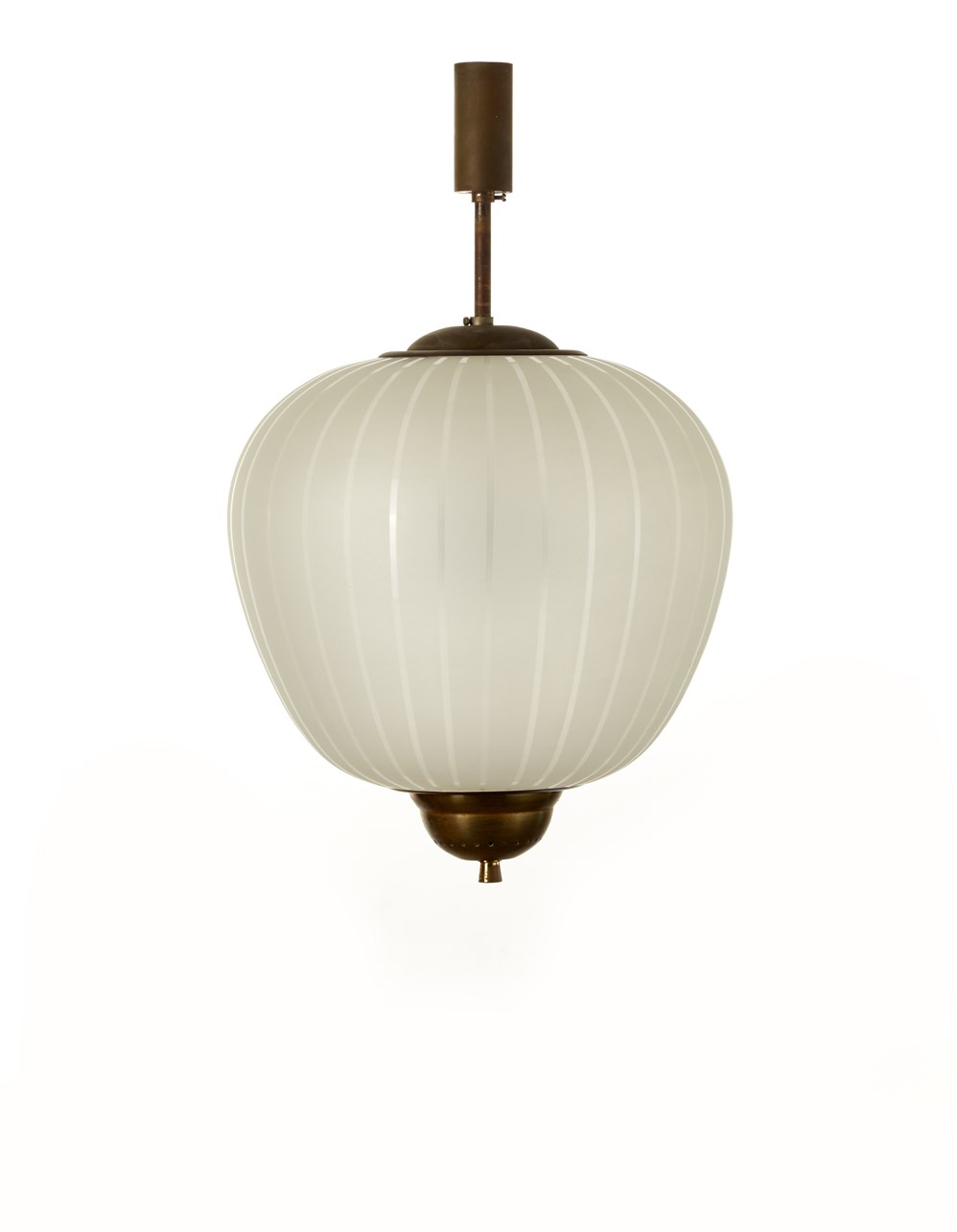 Small suspension lamp in brass and acidato glass. Italy, 1950s. (h 48.5 cm.; d 30 cm.) (slight defects)