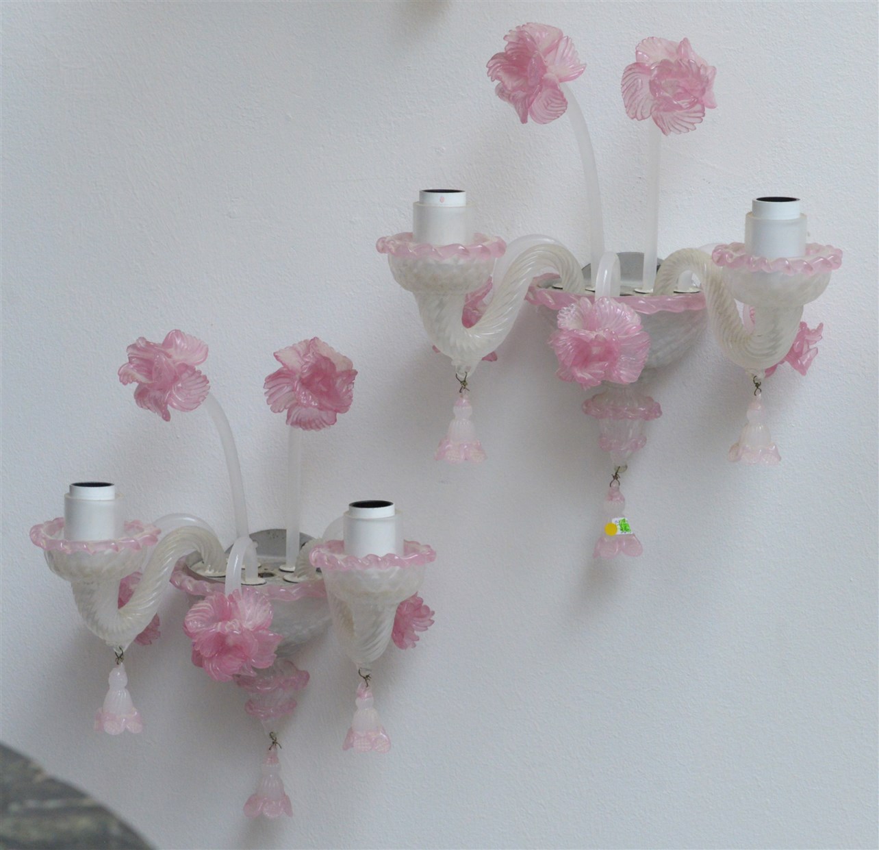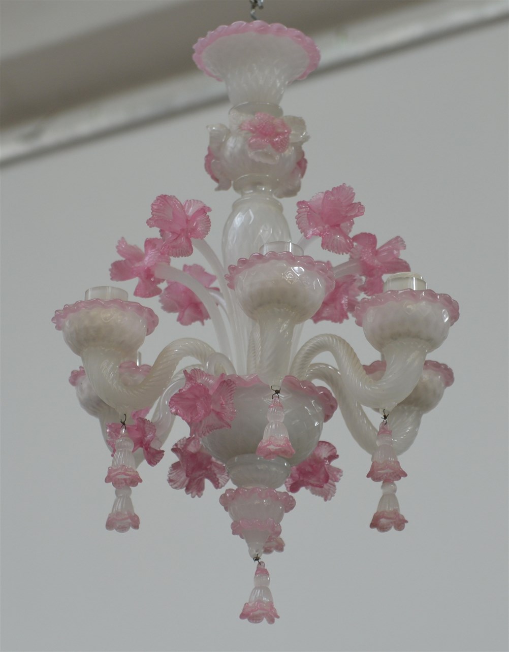 Lotto composto un piccolo lampadario a sei luci in vetro opalascente e rosa e una coppia di appliques in vetro soffiato opalescente e rosa con decorazione a fiori. (Lampadario cm ; Appliques cm h 35) (difetti e mancanze)