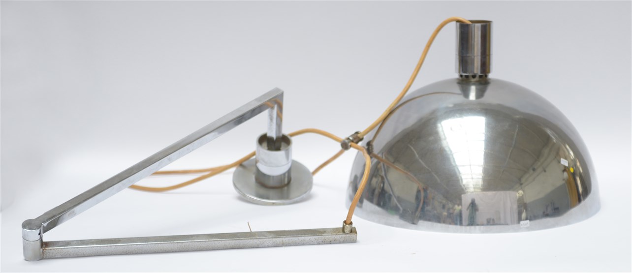 Lampada a sospensione della serie "AM/AS". Produzione Sirrah, Milano, 1969. Braccio snodabile e paralume in metallo cromato. (d cm 45; braccio snodabile l cm 104, 5) (difetti)