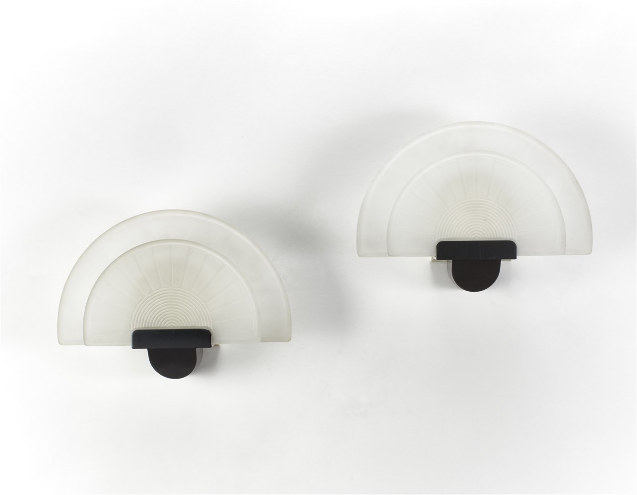 Coppia di lampade da parete modello "Diva". Produzione Arteluce, Milano, disegno del 1987, esemplari del 1991. Metallo verniciato bianco e grigio, diffusori in vetro acidato. Recanti etichetta del produttore. (cm 32x24x11)