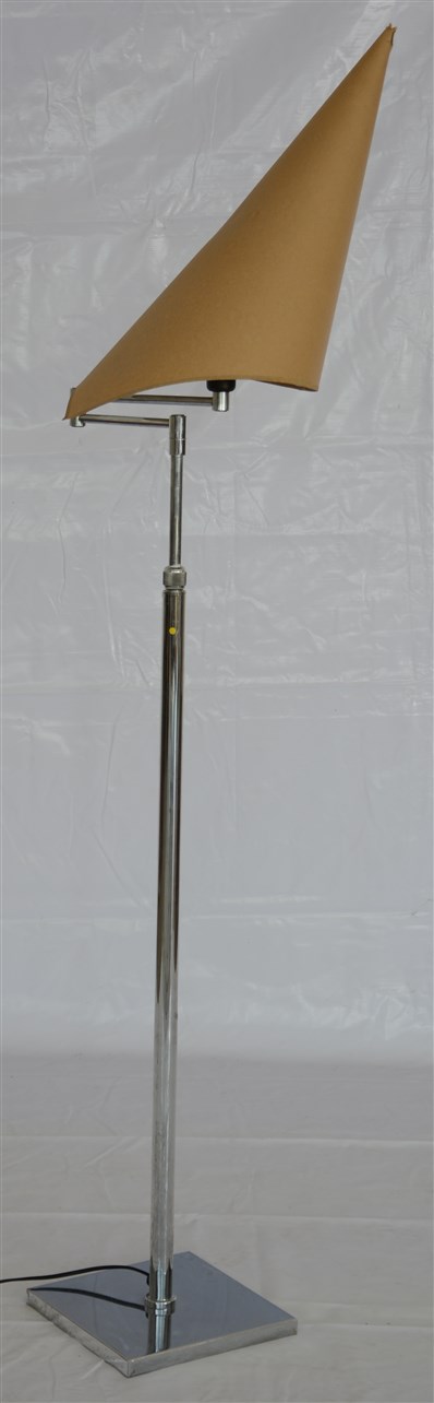 Lampada da terra con struttura regolabile in metallo cromato e paralume di forma conica in cartone. Italia, produzione recente. (altezza regolabile) (difetti)