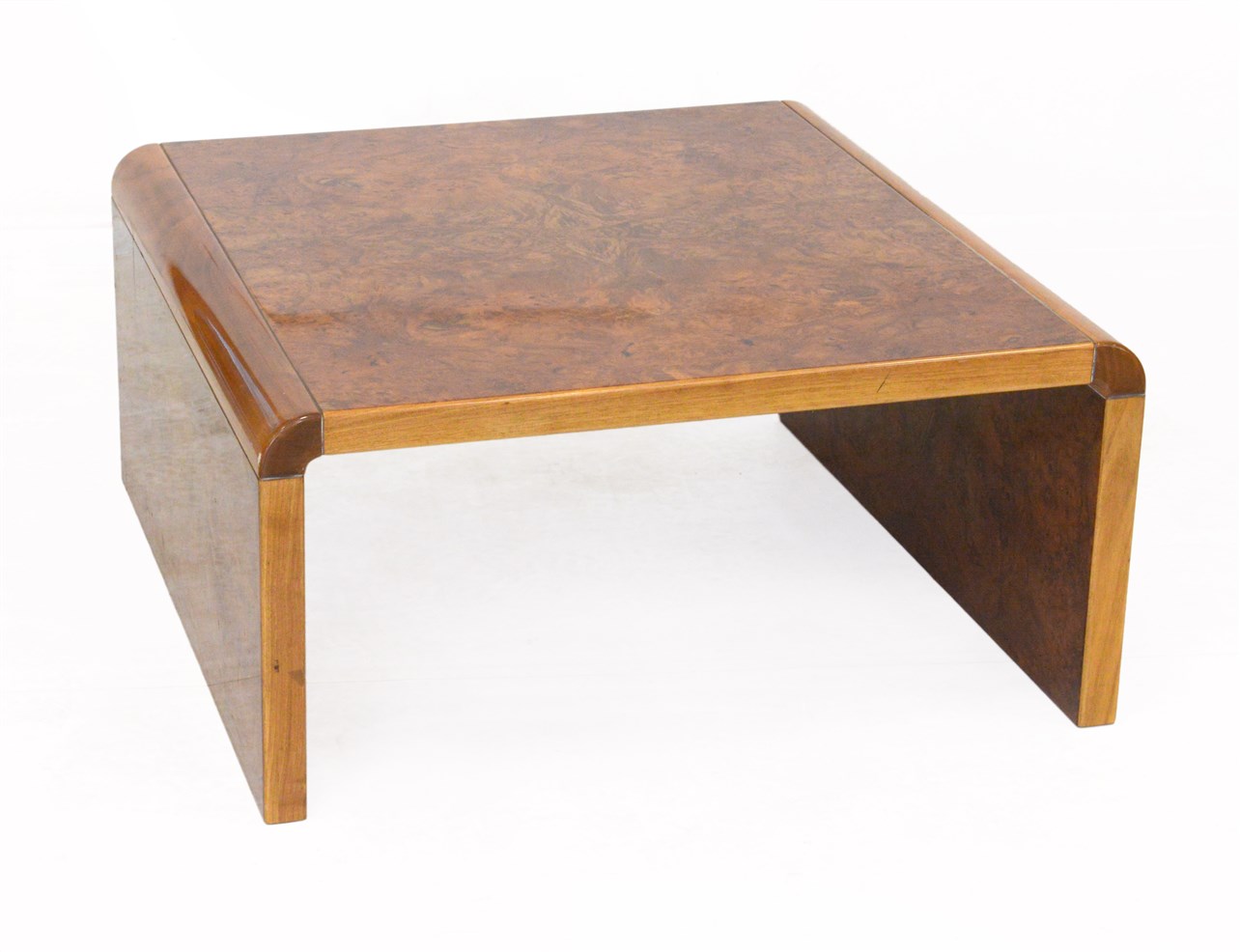 Tavolino da salotto impiallacciato in radica con angoli smussati. Italia, anni '80/'90. (cm 80x38x80) (lievi difetti)