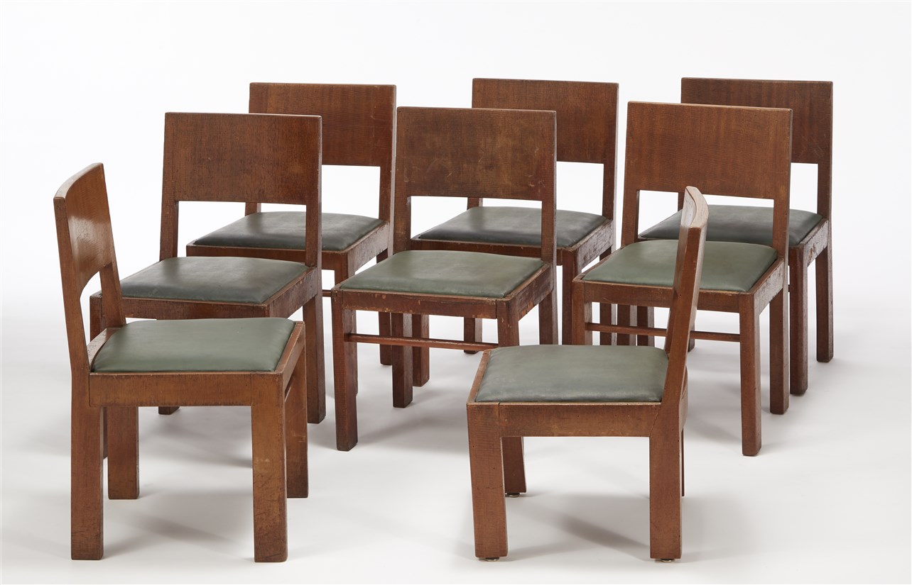 Gruppo di otto sedie razionaliste, lastronate in legno con schienale ricurvo e gambe parallelepipede. Italia, anni '30. (Gravi difetti e manomissioni)
