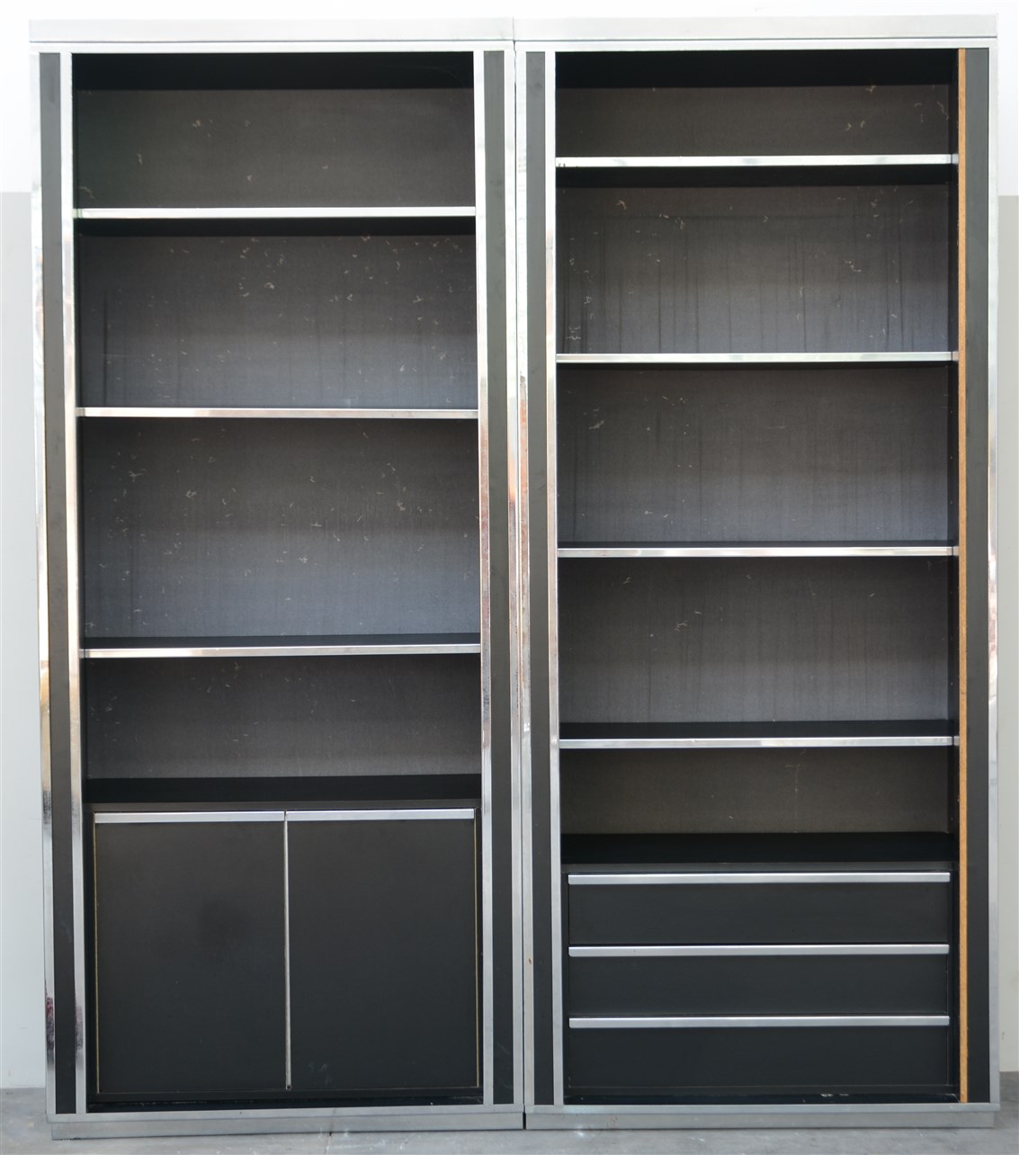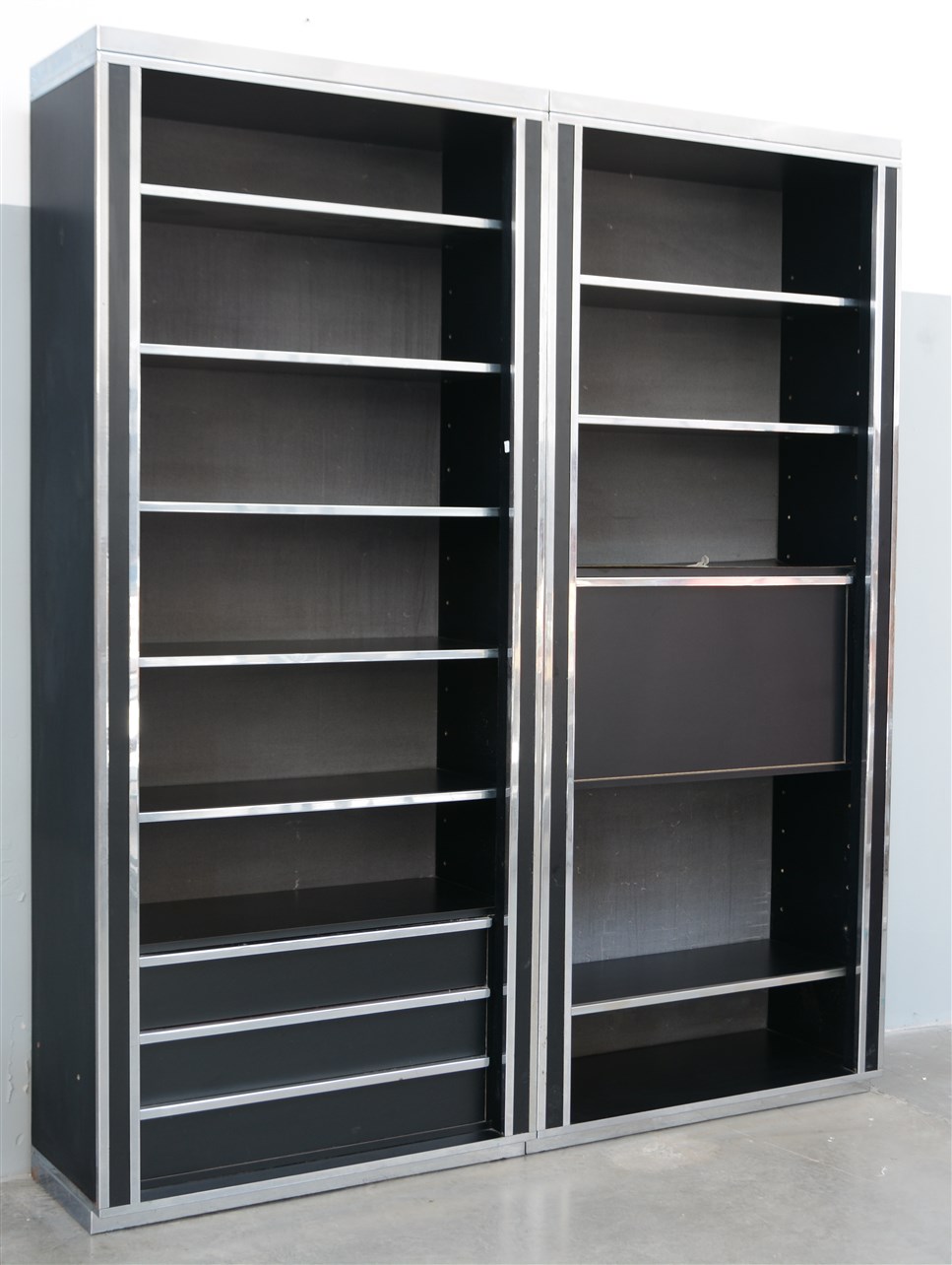 Gruppo di quattro librerie rivestite in laminato nero e bordate in metallo cromato. Italia, anni '70. (cm 100x237x45) (difetti e mancanze)