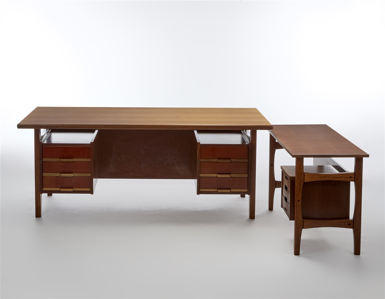 Scrittoio da dattilografa e scrivania a doppia cassettiera. Mantova, anni '70. Scrittoio in legno massello di mogano e cassetti in plastica e legno impiallacciato e scrivania in legno massello e borado di mogano con cassettiera in plastica, legno impiallacciato e alluminio ottonato. Recante etichetta del produttore. (cm 190x77x85 e cm 110x69x50) (lievi difetti e piccole mancanze)