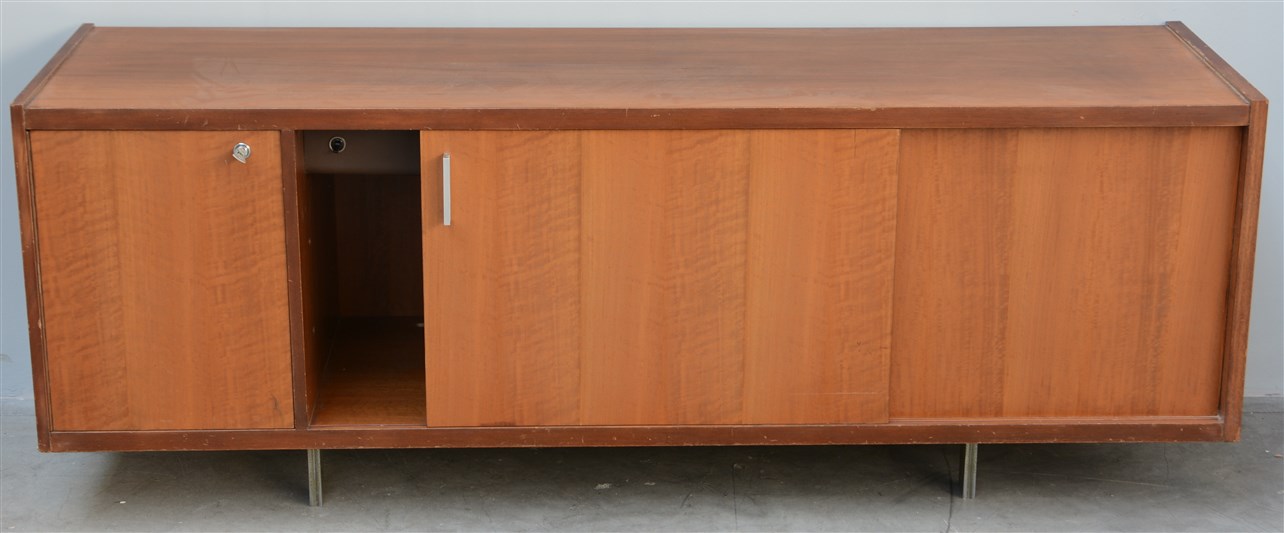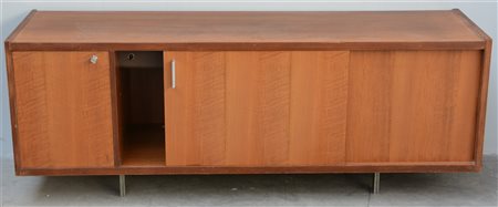 Sideboard in legno di noce impiallacciato con un'anta scorrevole e una incernierata, gambe in metallo cromato. Anni '50. (cm 160x60x46) (difetti e modifiche)