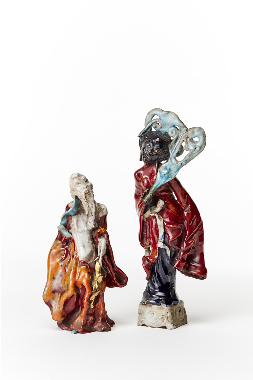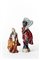 Coppia di due statuine orientali in ceramica modellata a mano e smatata in policromia e oro. Italia, anni '50. (h cm 23 e h cm 16,5) (difetti, restauri e mancanze)