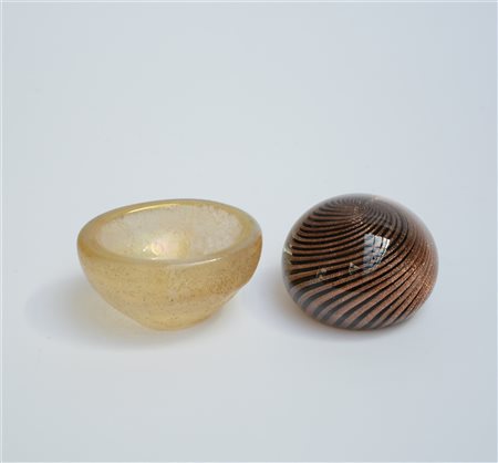 Lotto composto da una bomboniera in vetro soffiato incolore corroso sulla superficie esterna e con inclusione di foglia d'oro unito a un presse papier in vetro sommerso con canna a spirale in pasta vitrea nera e avventurina. (h cm 36) (difetti)