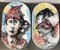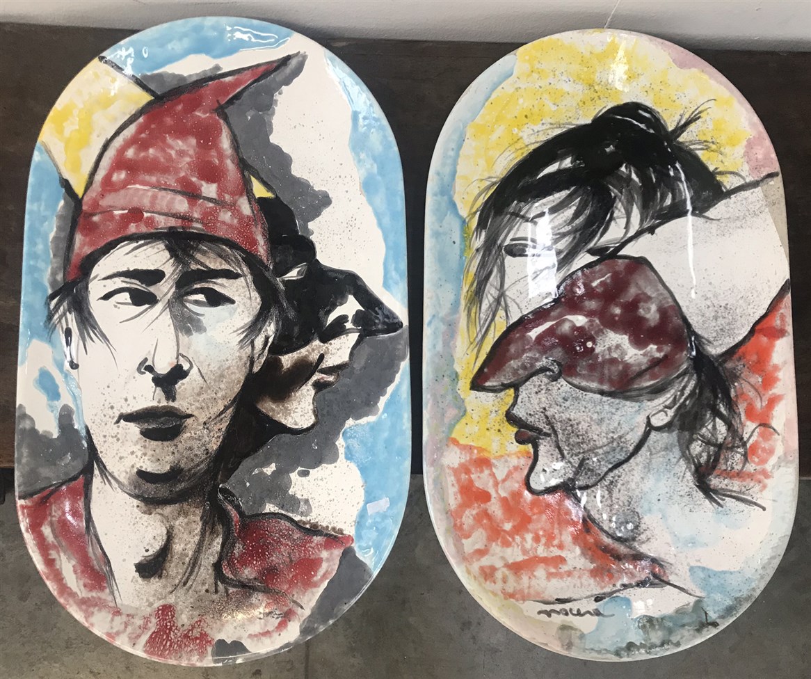 Coppia di piatti ovali in ceramica policroma decorati a figure e maschere. Uno