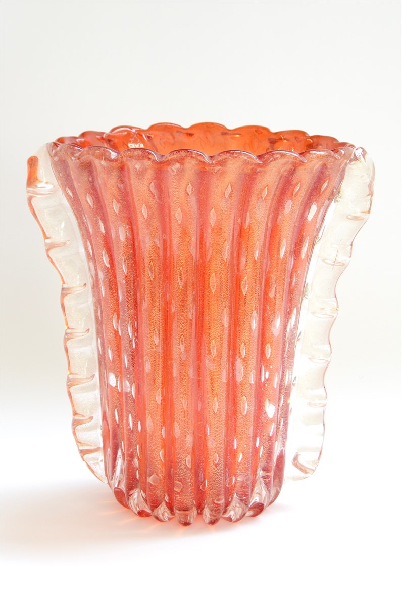 Manifattura d Murano Vaso a morise in vetro costolato incolore e rosso con incl
