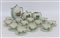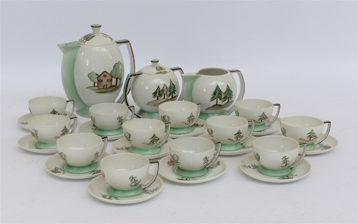 Servizio da tè a forma di sfera in ceramica formata a colaggio, decorato a mano in verde e marrone con soggetti alpini, composto da una teiera, una latteria, una zuccheriera e dodici tazzine complete di piattini modello "Verbano ". Laveno, 1936. Datato e firmato sotto la base dalla decoratrice "Adele 1936 XIV". (lievi difetti)
