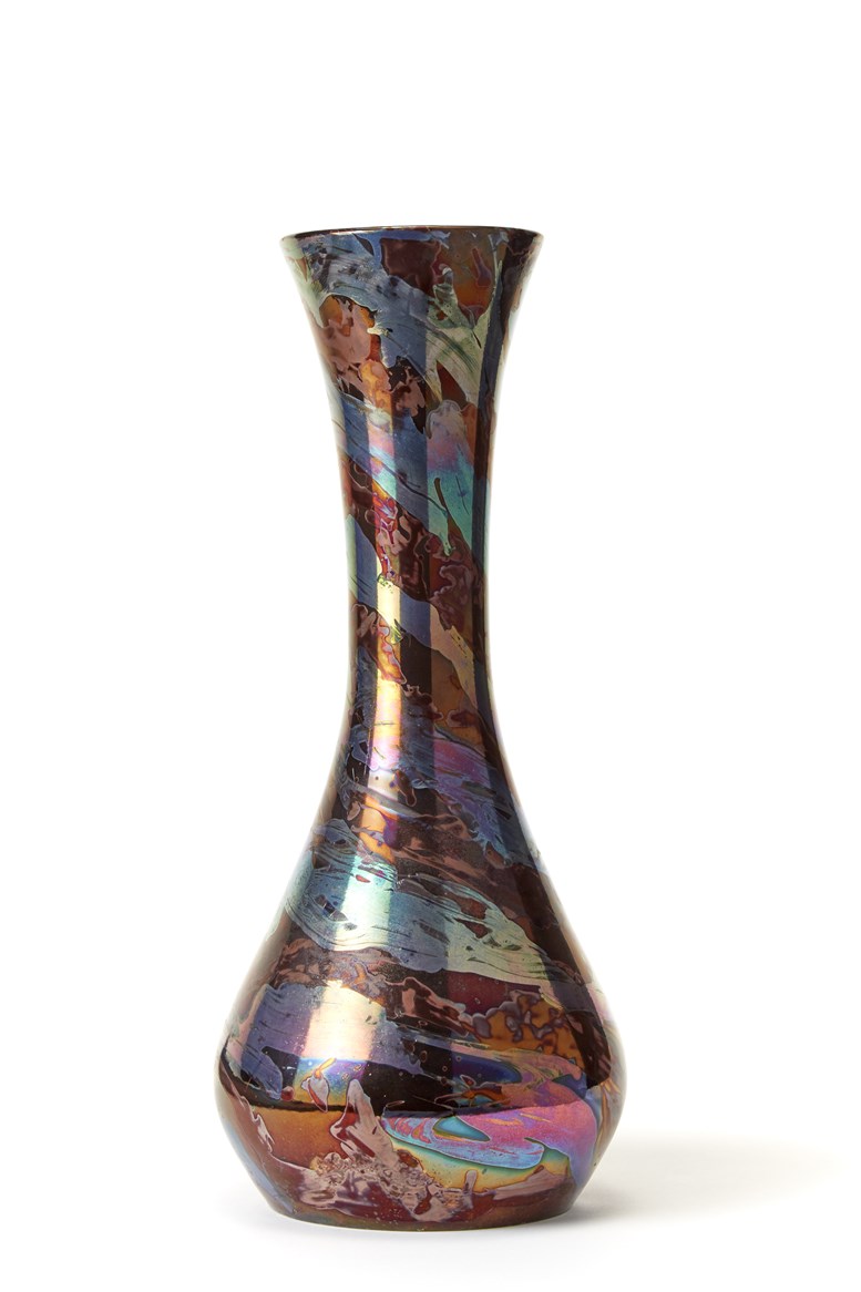 Grande vaso bulbiforme a collo allungato in ceramica smaltata con soggetto informale nei toni del vinaccia, del grigio e del celeste a riflessi metallici. Manifattura G. Mazzotti, Albisola, anni '50. Firmato sotto la base. (h cm 49) (lievi difetti)