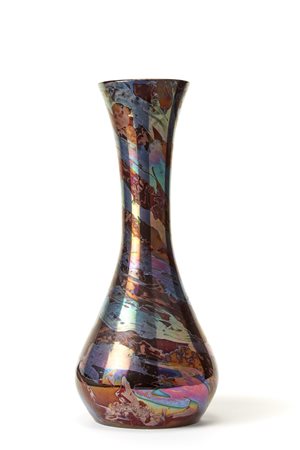 Large bulbous vase with elongated neck in glazed ceramic with informal subject in shades of purple-red, gray and light blue with metallic reflections. Manufacture of G. Mazzotti, Albisola, 1950s. Signed under the base. (h 49 cm.) (slight defects)