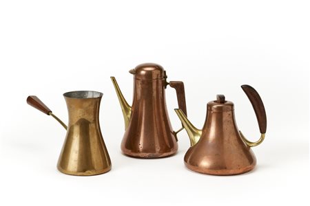 Lotto composto da una teiera, una lattiera e una caffettiera in rame e ottone con manici rivestiti di legno. Esecuzione Wiener Werkstätte, Vienna, inizio secolo XX. Marcati sotto la base. (misure diverse) (lievi difetti)