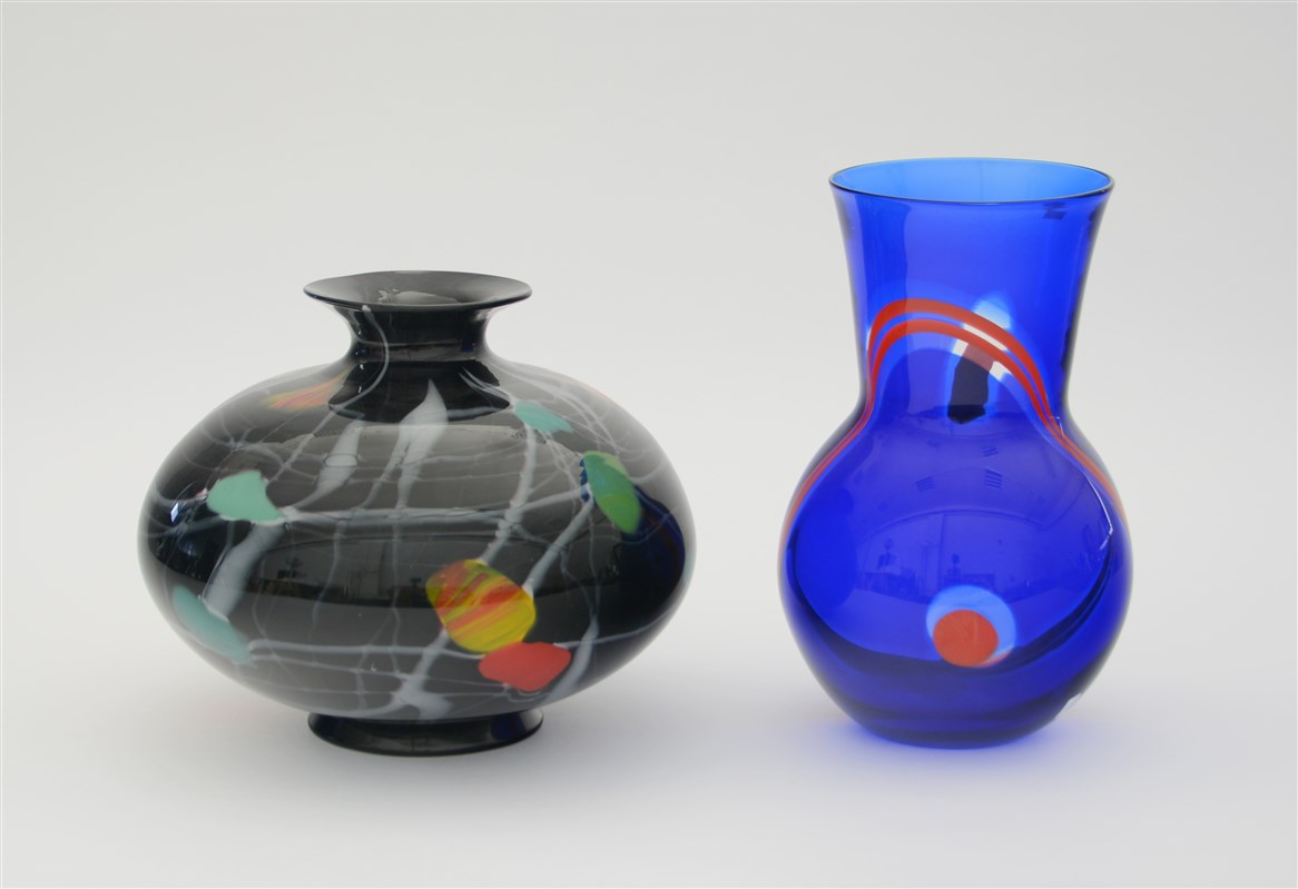 Archimede Seguso Lotto di due vasi in vetro soffiato trasparente blu, rosso e in