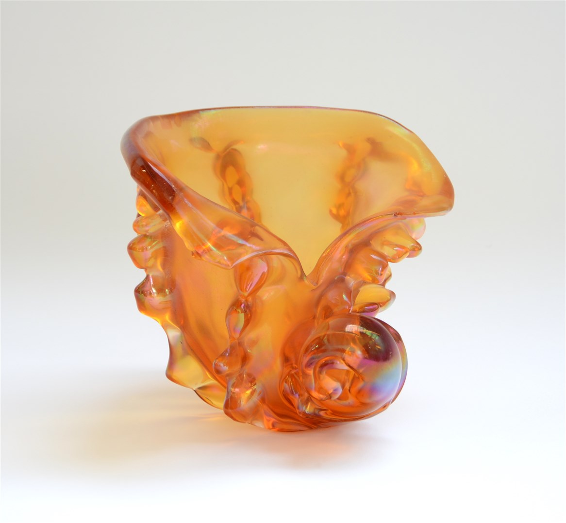 Vaso in vetro soffiato arancione trasparente con superficie esterna fortemenete iridata. Anni '80/'90. (h cm 22) (lievi difetti)