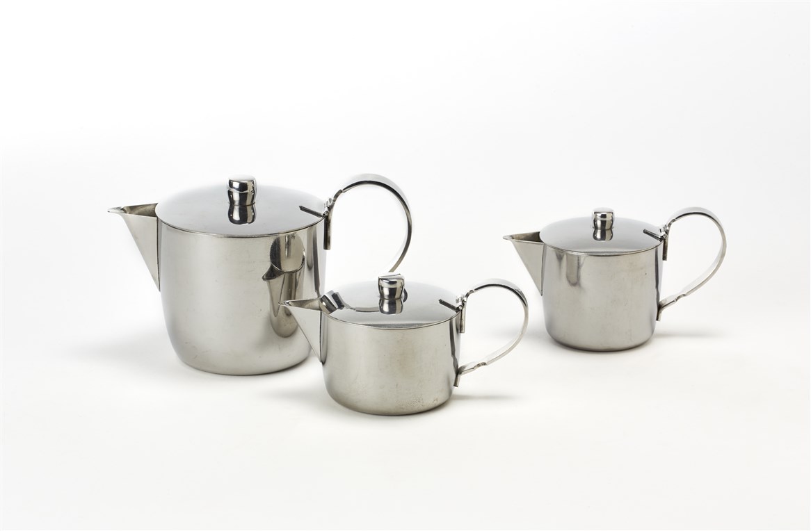 Lotto composto da lattiera, una teiera, una caffettiera in metallo disegnate per Agip. Milano. (misure diverse) (lievi difetti)