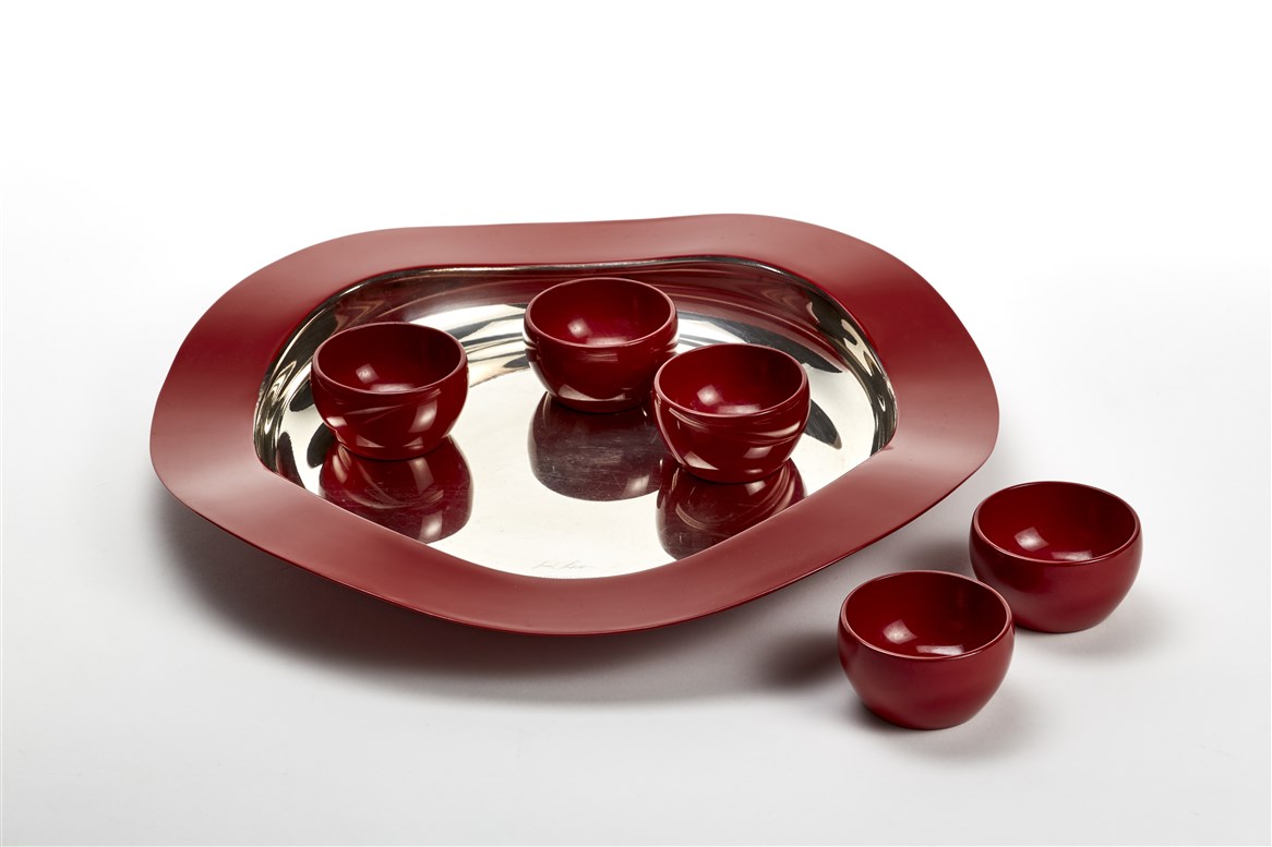 Vassoio della serie "Memoria di un angelo". Bregnano, 2002. Metallo argentato laccato rosso. Firmato a punta e a incussione "Lino Sabattini ONDA - 2002 COLLEZIONE SABATTINI ITALY" e recante il simbolo grafico della manifattura. (d cm 37) (lievi difetti)