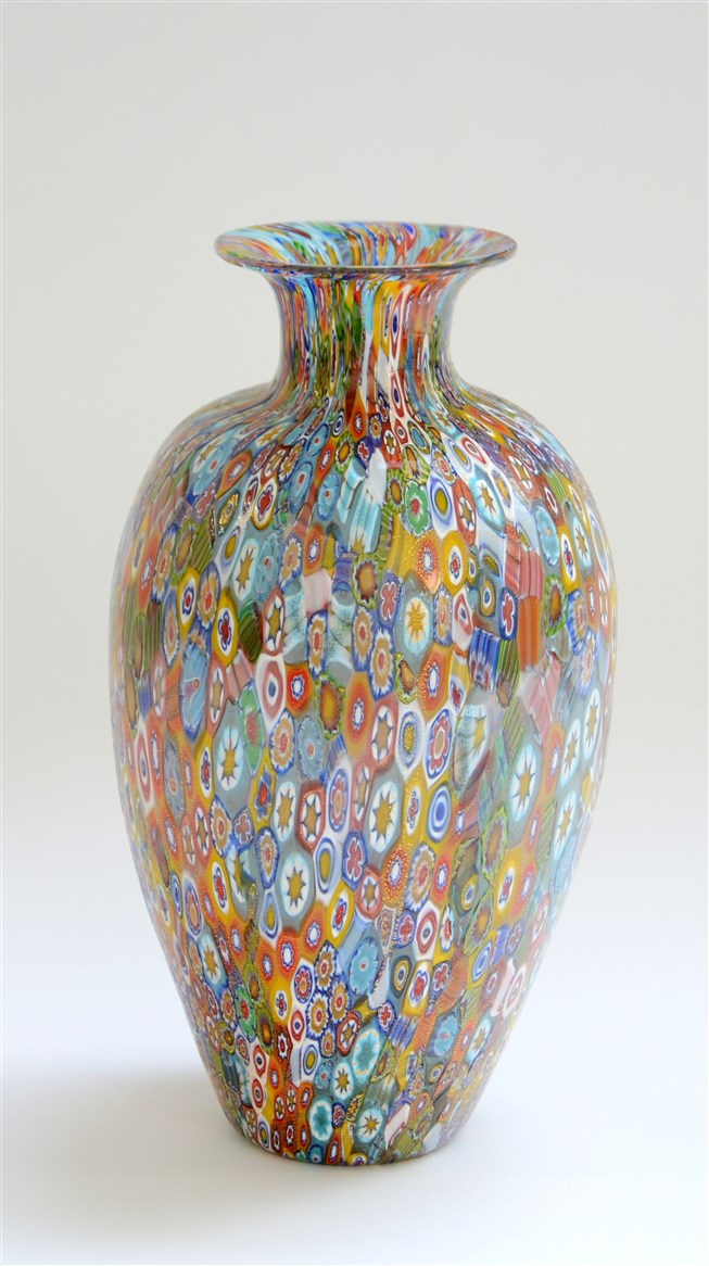 Vaso in vetro soffiato a murrine millefiori. Anni '90. (h cm 27)