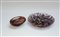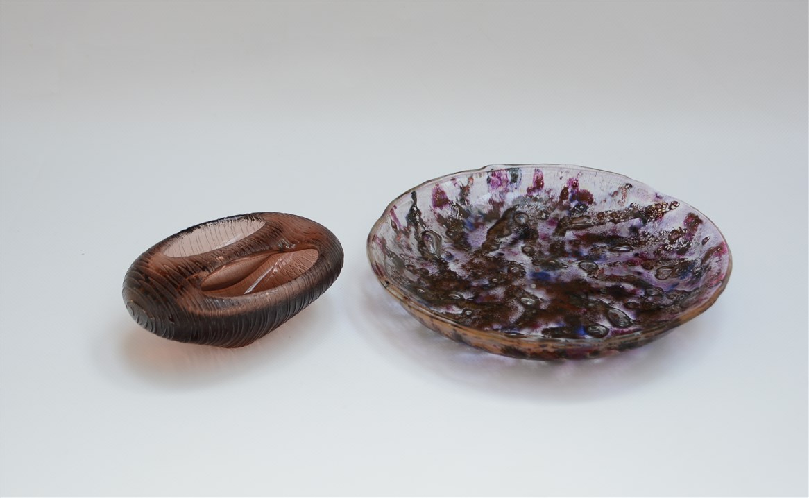 Posacenere in vetro ametista corroso e lavorato alla mola sulla superficie esterna unito a un piatto in vetro soffiato con inclusioni di bolle policrome. Anni '60/'70. (lievi difetti)